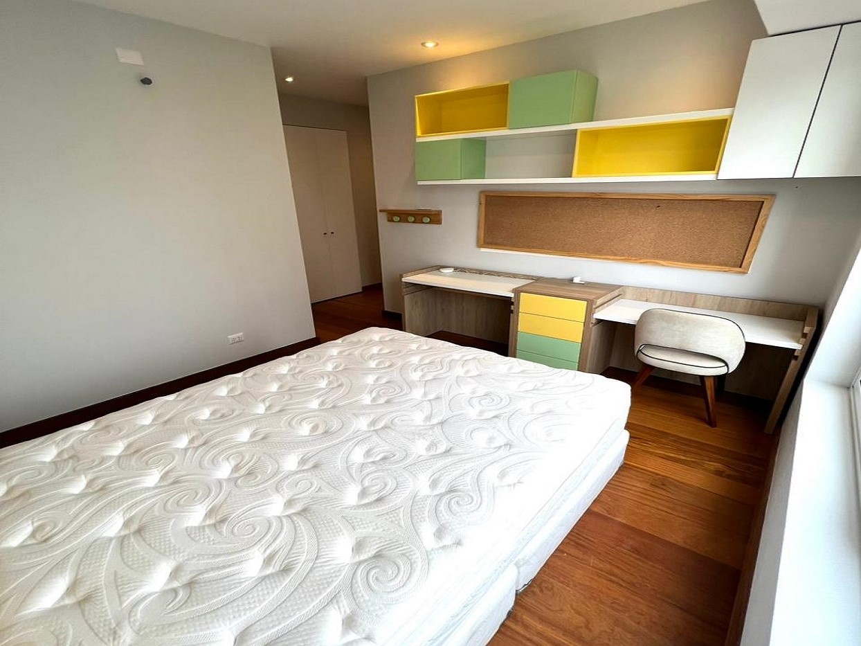 Dormitorio 2 con cortina roller, doble escritorio y muebles de diseño, cama Queen, amplio closet y Baño con griferías Kohler