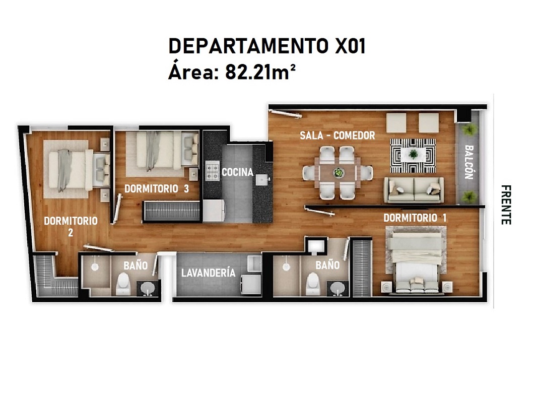 ---DISTRIBUCIÓN--- Ingreso al Departamento + Sala Comedor con mampara que da hacia el Balcón + Balcón vista frontal exterior a avenida + Cocina Kitchenette Equipada con Muebles de melamine Altos, Bajos, y Tablero de granito (incluye: Cocina encimera + Horno empotrado + Campana Extractora) + Área de Lavandería separada + 3 Dormitorios con closets (Principal con Baño privado) + Baño de visita con ducha (compartido para Dormitorios Secundarios). Total 2 Baños con Ducha, Depósito: NO.