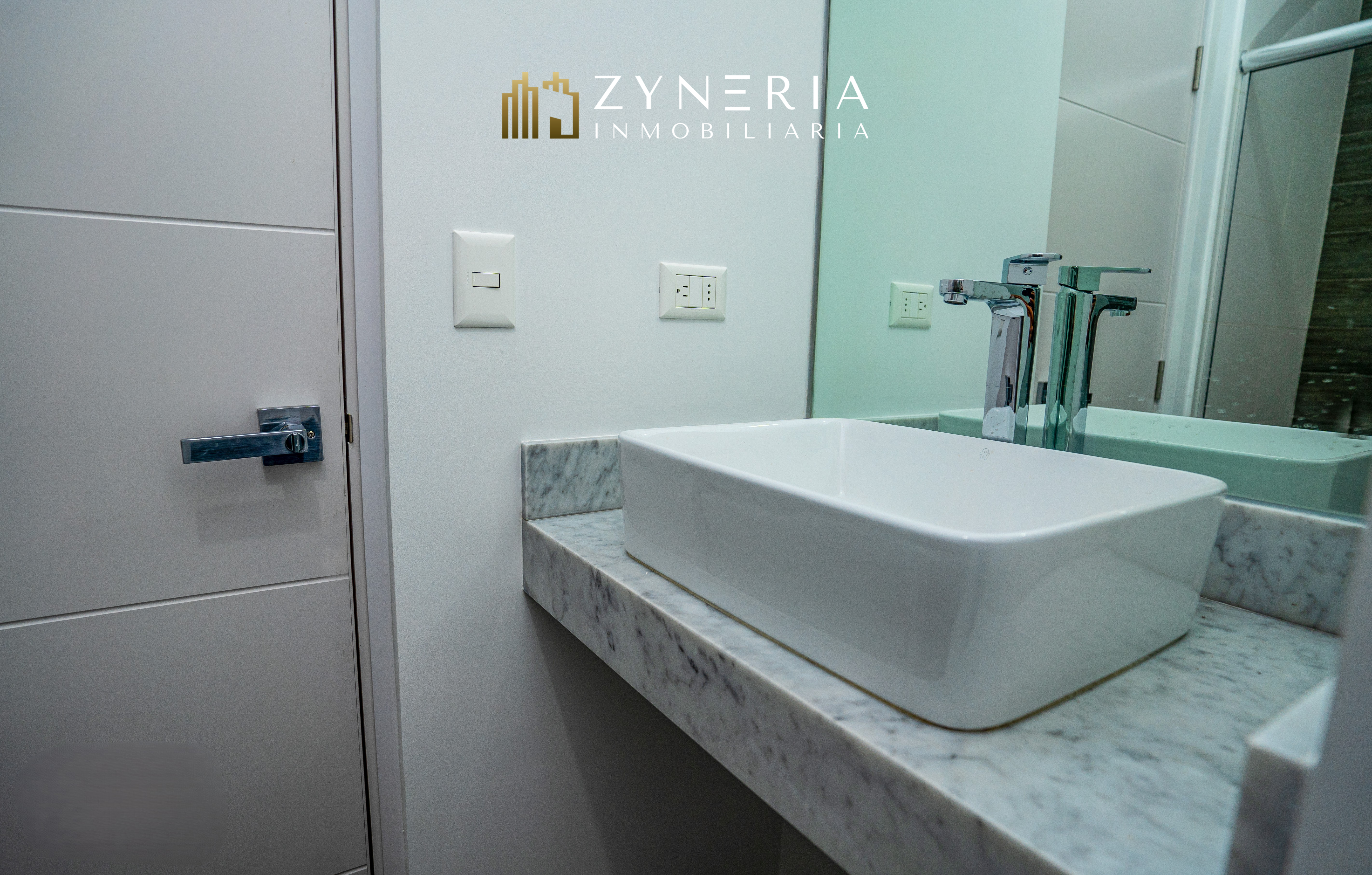 -1 Baño Completo: Acabados de lujo, con mesa de mármol y elegantes puertas de vidrio en la ducha.
